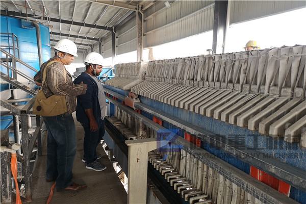 上圖:國外客戶在現(xiàn)場了解隆中壓濾機(jī)使用方法: